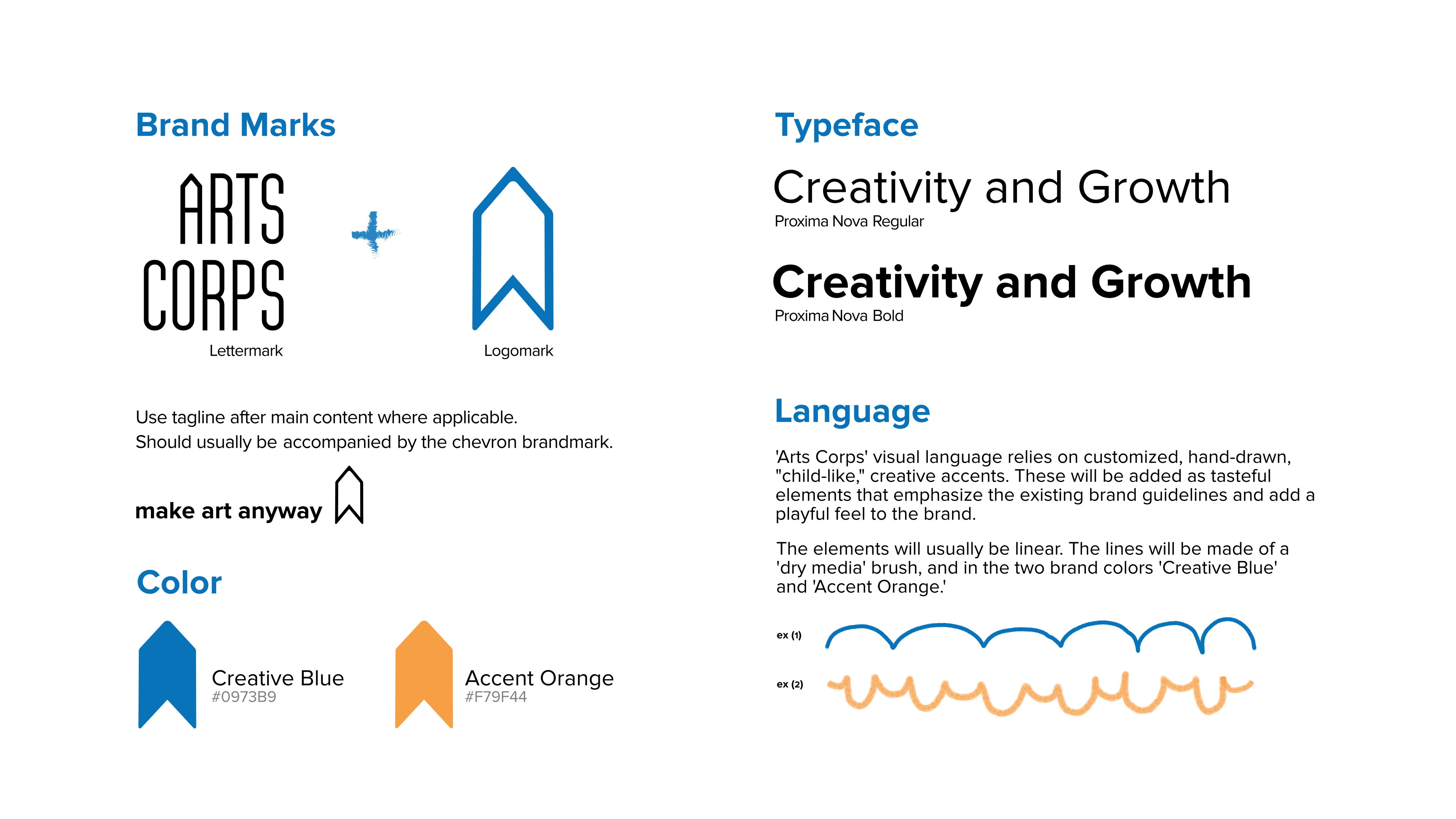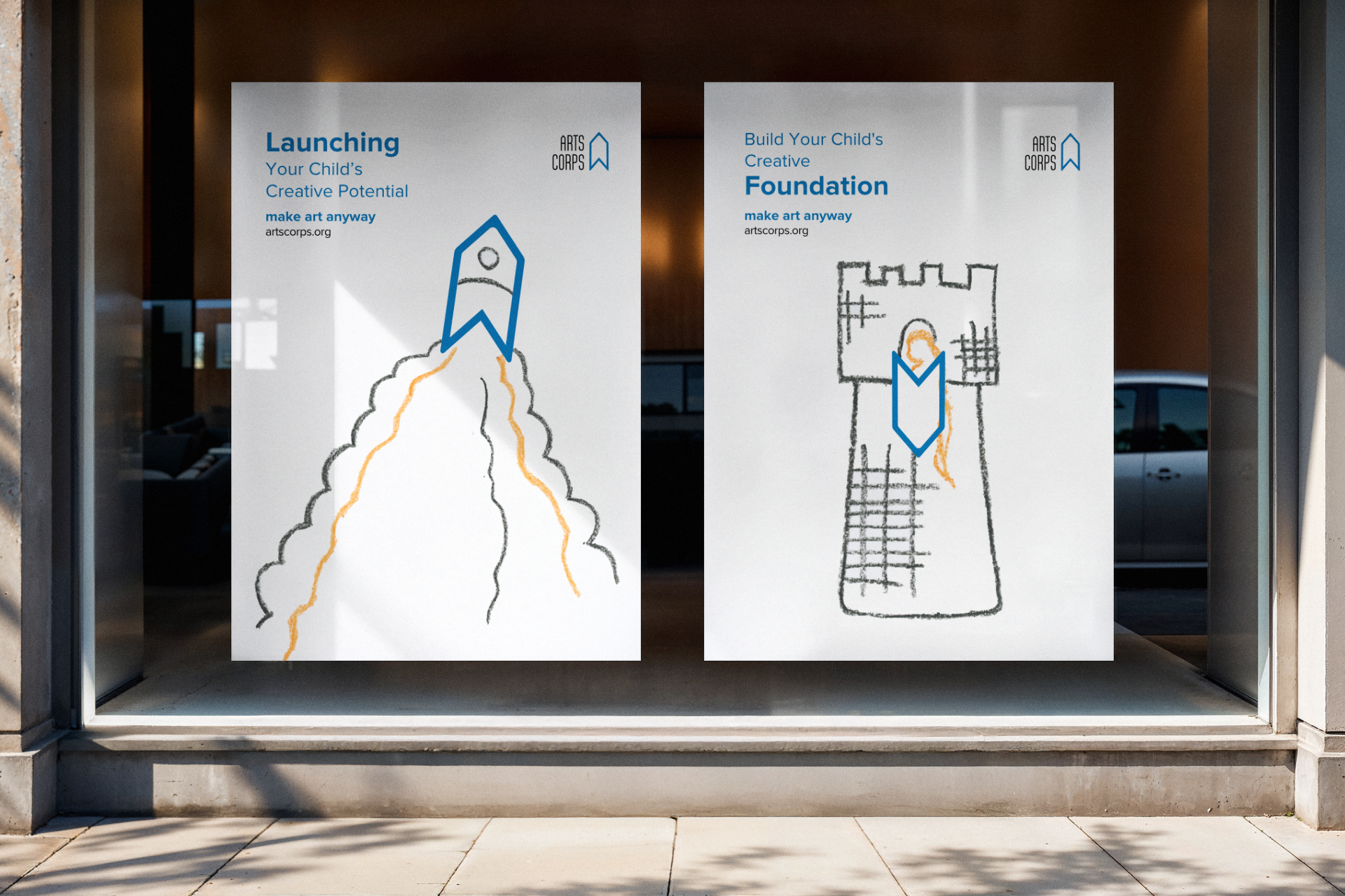 Arts Corps has a vision where 'barriers to arts education no longer exist and all young people can creatively lead the transformation of schools, neighborhoods, and beyond.' To reflect this dream of youthful creativity, a new identity must have a playful attitude.